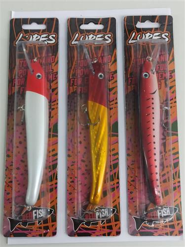 Señuelo en polimero de alta densidad. Ideal baitcast y spinning. Ojos 3D muy llamativos con rattlin. Se recomienda para surubi, chafalotes y dorados. Anillas y anzuelos reforzados. Colores Varios EFECTIVOS.
